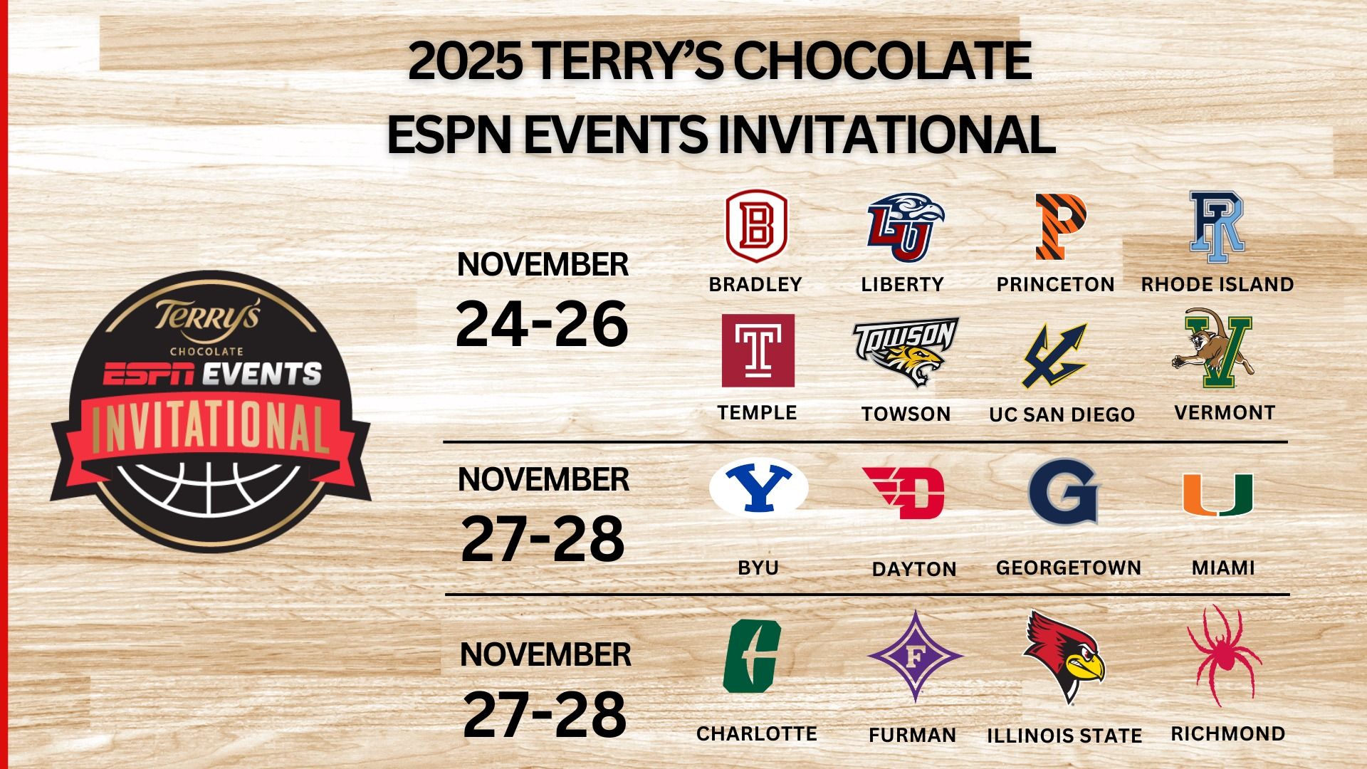 The ESPN Events Invitational features 16 teams split into four brackets: Magic (BYU, Miami, Georgetown, Dayton), Imagination, Adventure, and a fourth bracket.
